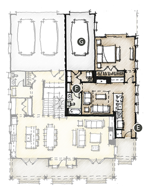 As time passes by, and life happens, the primary intended use for the multi-gen suite can be easily reconfigured to an accessory dwelling unit (ADU) for the next stage in the owner’s life. The ADU option features an enclosed one-car garage, owner’s entry and a full kitchen for a truly private experience; this space can become a rental property or provide a separate living space for the now grown kids. The last step in the home cycle occurs when the owners become older in age. There is a greater need for an accessible master down option that better integrates into the heart of the home.