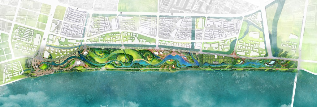 The site is located in an area that is well-known for textiles. The design team built on the idea of using textiles, patterns and thread as an inspiration. This manifested itself as the “Tapestry Along the Yangtze River”, including threads of culture, ecology and art.