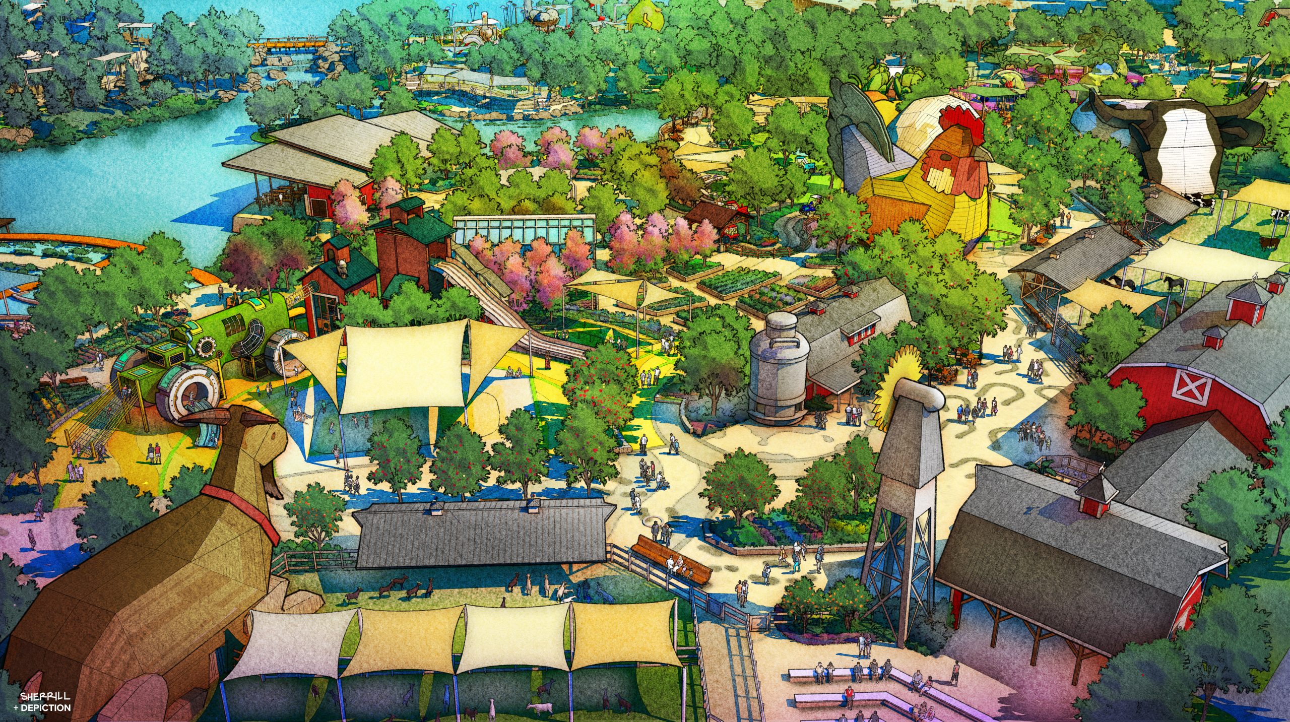Leverage the Story Throughout the Park. Vertical features and elements should tie to the concept and the idea. Identify icons to foster understanding of the story and celebrate the vision.
