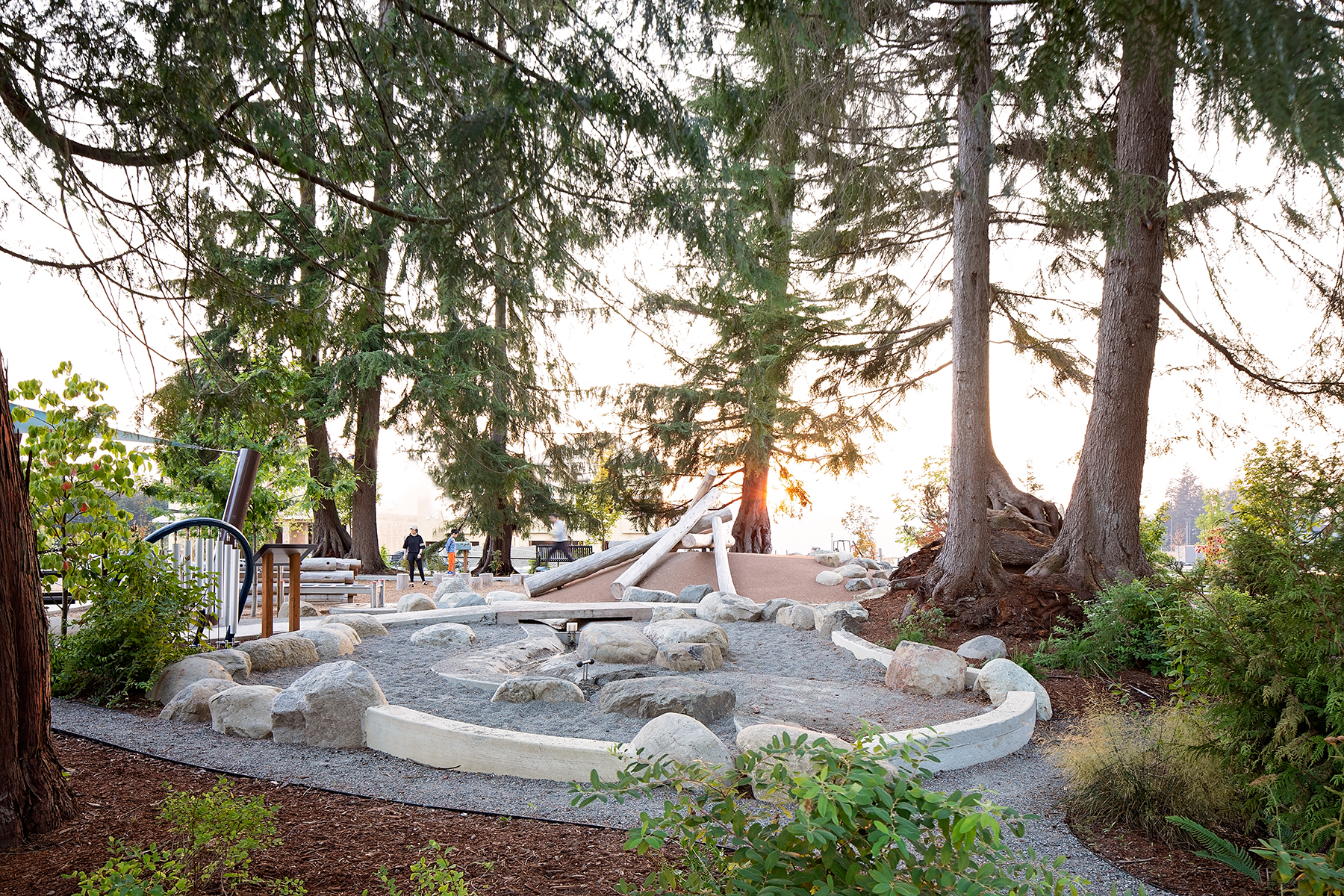 The Duvall One-Acre Park design is inspired by the large existing conifers typical of the Pacific Northwest. The forms and textures are interpretations of tree rings and can be seen in the shelter’s form and paving patterns; and the climbing wall is a bark-peeled log expression. This park is focused on creative play, nature play and smaller group gatherings. The water play element is a scaled representation of the adjacent Snohomish river and valley. Unique features like the log scramble, tunnel, musical chimes and woodland exploration trails all connect the site to its context.
