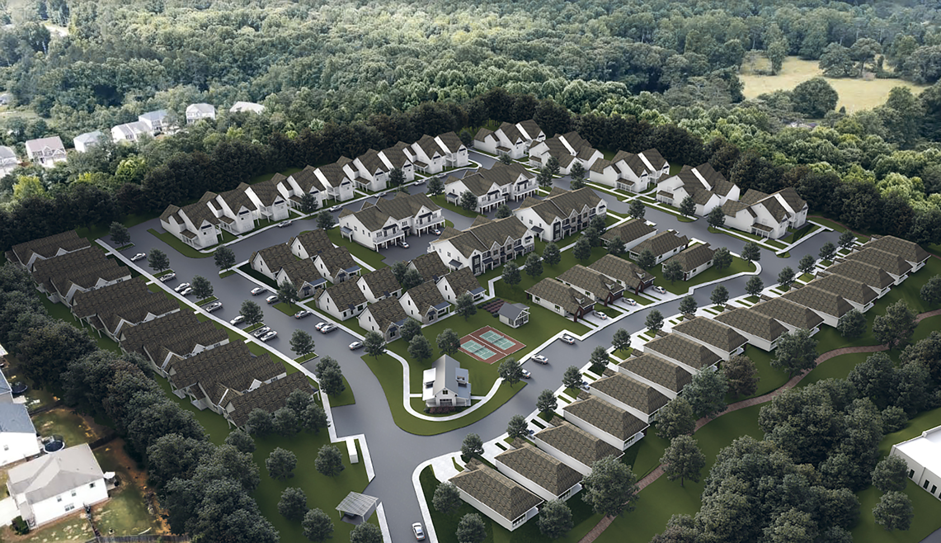 The latest concept in 55+ for lease housing, this neighborhood of rental cottages and flats is designed exclusively for the 55+ market. Nestled across a natural area behind highway oriented commercial uses, the cottages include a variety of floor plan options, a full-service clubhouse and outdoor amenity package set in an intimate, pedestrian oriented traditional neighborhood design. The clubhouse and leasing center is conveniently located upon arrival to the neighborhood and includes pickleball courts, resident gardens and abundant gathering space. The neighborhood includes ten different floor plan choices in single family cottages, paired homes, and stacked flat configurations offering a variety of lifestyle and pricing options.