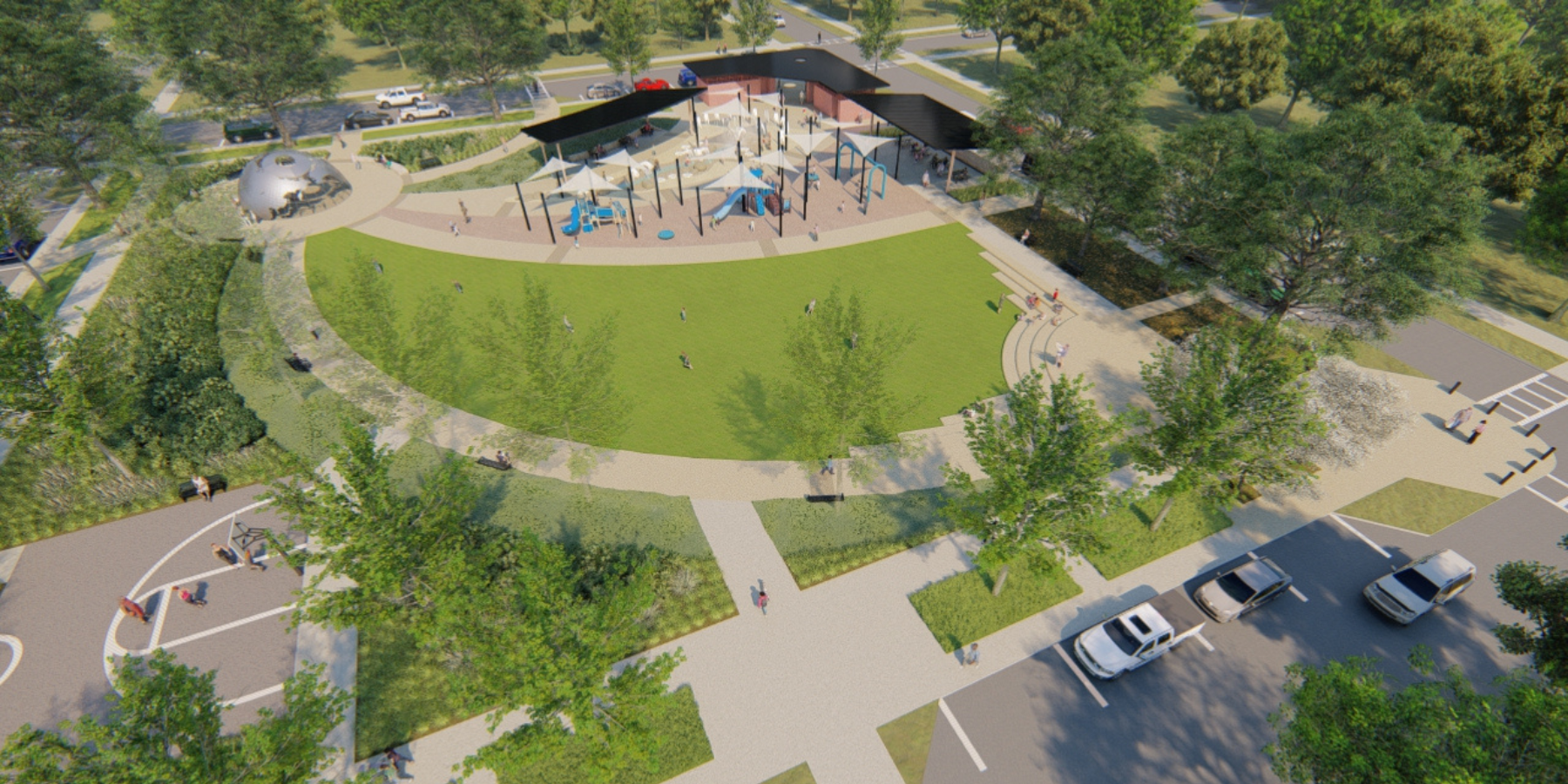 This Ennis, Texas park honors the legacy of former Ennis resident, Navy sailor Timothy Gauna. Tim was killed in the U.S.S. Cole Bombing in October 2000. DTJ incorporated stories from interviews with Tim’s family, fellow sailors, and City representatives, crafting a renovation master plan that memorializes his story and improves the quality of life in his hometown. The spiraling layout is reminiscent of a galaxy, drawing visitors in towards the globelike memorial. The globe displays Tim’s journey across the world and recreates the spatial sensation of being enclosed in a ship at sea. Recreation offerings include a basketball court, field, playground, splashpad, restrooms, and event pavilion.